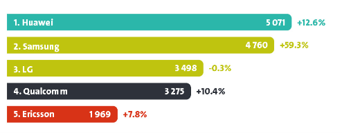 Lo primero a destacar es que de las cinco las tres primeras son asiáticas, la cuarta norteamericana y en quinta y última posición una europea. Si nos fijamos en el porcentaje de crecimiento también son primeras las asiáticas, excepción hecha de la coreana LG que tiene un ligero decremento (-03%) respecto al año anterior. Primero y con un desorbitado crecimiento la otra empresa coreana, Samsung, ni más ni menos que de un 59,3%. Segunda la china Huawei con un ya moderado 12,6% de incremento, casi idéntico a la tercera, la norteamericana Qualcomm (10,4%) y por último la europea Ericsson (7,8%).