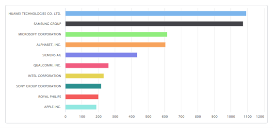 HUAWEI (otra vez la primera, como en Comunicación digital), SAMSUNG (el segundo es el gigante surcoreano), MICROSOFT (la archiconocida empresa norteamericana creadora de WINDOWS y OFFICE con sede en Redmond, fundada en 1975 por Bill Gates y Paul Allen), ALPHABET (también norteamericana y cuya principal filial es GOOGLE, con sede en Mountain View en California y fundada en 2015 por Larry Page y Serguéi Brin), SIEMENS (la empresa alemana ya comentada anteriormente), QUALCOMM (norteamericana ya citada anteriormente), INTEL (la archiconocida empresa norteamericana creadora de los procesadores de ordenador personal más usados, fundada en 1968 por Gordon Moore y Robert Noyce y con sede en Santa Clara en California), SONY (la empresa japonesa conocida por todos, creadora de la PLAYSTATION, con sede en Tokio, fundada en 1946 por Akio Morita y Masaru Ibuka), PHILIPS (la empresa holandesa ya citada anteriormente) y APPLE (la conocida empresa norteamericana fundada por Steve Jobs, Steve Wozniak y Ronald Wayne en 1976 y con sede en Cupertino en California).