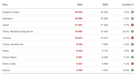 Ilustración 1: Ranking mundial de los 10 primeros países solicitantes de patentes en la ERO en 2021.
