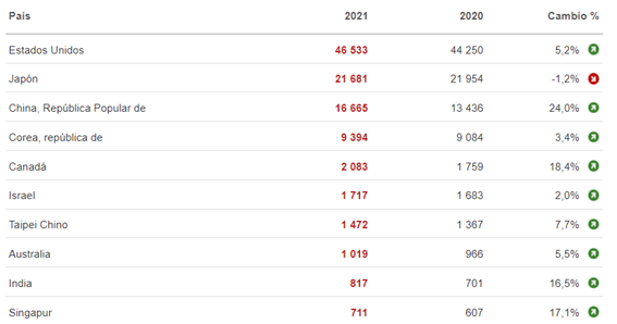 Los cuatro primeros puestos ocupados por Estados Unidos, Japón, China y Corea del Sur que ya se han comentado en apartados anteriores. Quizás hacer dos salvedades.