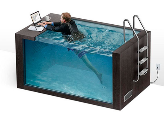 Y el último invento raro es el Swin Desk. El Swim Desk es una mesa de despacho convertida en piscina.