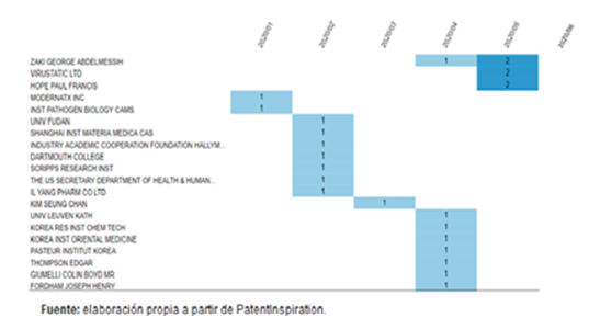 Ilustración 2.- Cantidad de solicitudes de patentes sobre COVID-19 por solicitante Vs Tiempo (realizado por el VINTEC).